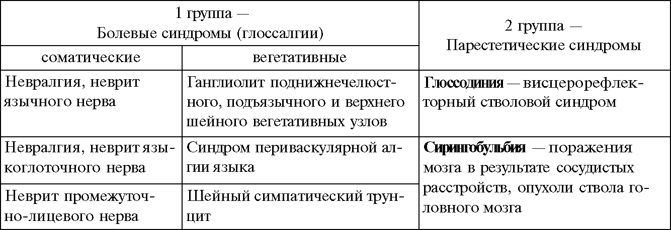 Некоторые специалисты [ВАЕпишев, Ф.М.Мамедова, 1970; А.В.Клементов, Р.Ф.Гайфуллин, 1973; Е.В.Боровский и Н.Ф.Данилевский, 1984 и др.] рассматривают глоссолгию, глоссодинию, парестезию слизистой оболочки полости рта и языка как синонимы.