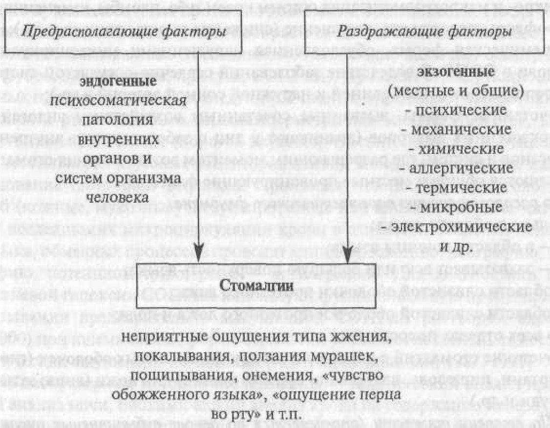 Причины возникновения стомалгий полностью не раскрыты. Однако нам представляется, что заболевание это полиэтиологическое и в его возникновении бывают повинны как эндогенные, так и экзогенные факторы (рис. 55). Стомалгии, сочетаясь с различными заболеваниями внутренних органов и систем, являются не самостоятельной нозологической формой, а синдромом, предшествующим или сопутствующим этим заболеваниям. Ряд раздражающих факторов общего и местного порядка (психических, механических, химических, аллергических, термических, микробных и т.п.) может провоцировать возникновение стомалгий [Л.М.Перзашкевич, Е.М.Тер-Погосян, А.К.Иорданишвили, 1986]. Важным патогенным фактором в возникновении стомалгий является тканевая гипоксия, обусловленная нарушениями микроциркуляции крови в СОПРиЯ.