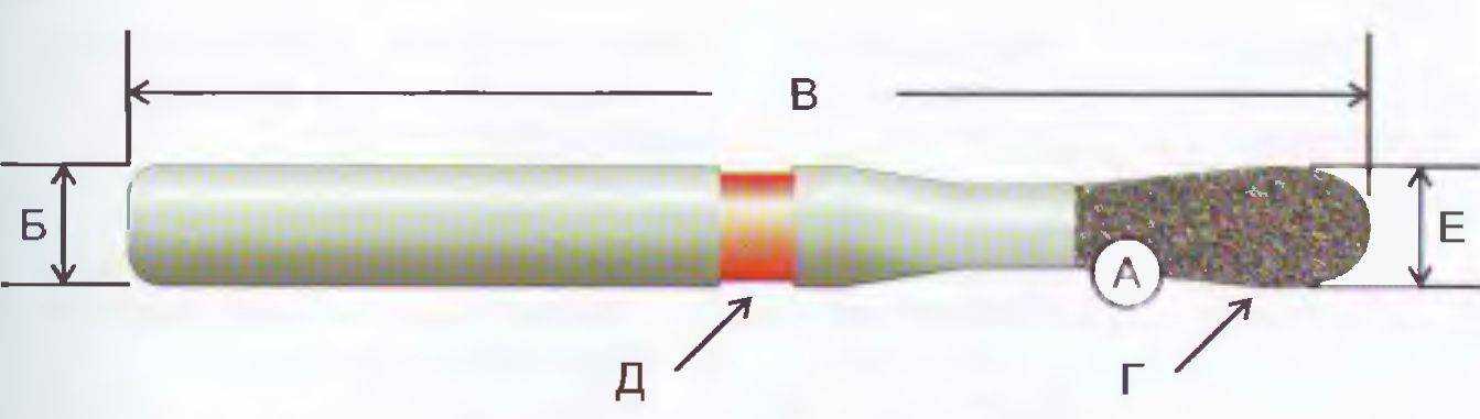 Рис. I. Обозначение бора по системе ISO: А — материал рабочей части бора; Б — диаметр хвостовика; В — общая длина; Г — форма рабочей части; Д — зернистость рабочей части; Е — диаметр рабочей части