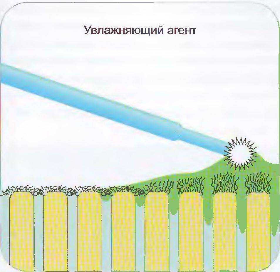 Помимо основного эффекта снижения чувствительности большинство десенситаизеров также выступает в качестве увлажняющего агента перед нанесением дентинового адгезива при изготовлении композитных реставраций, что улучшает прочность сцепления. Принцип действия заключается в смачивании спавшихся после избыточного просушивания поверхности дентина коллагеновых волокон для хорошего прохождения адгезива в канальцы и обеспечения более прочного влажного бондинга (рис. 18).