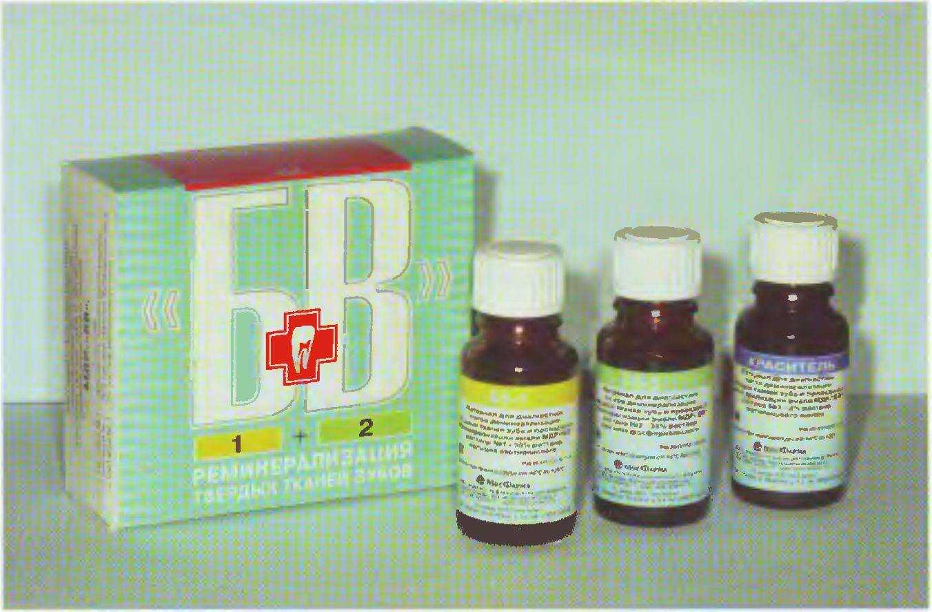 В комплект материала «БВ» {рис. 20 а) входят два водных раствора: нитрата кальция («БВ-1») и фосфорнокислого аммония («БВ-2»), при взаимодействии которых происходит образование минерального осадка (аморфного фосфата кальция и дикальцийфосфат дигидрата), близкого по химическому составу к гидроксиапатиту твердых тканей зубов. Кроме этого в комплекте имеется краситель для определения очагов деминерализации.