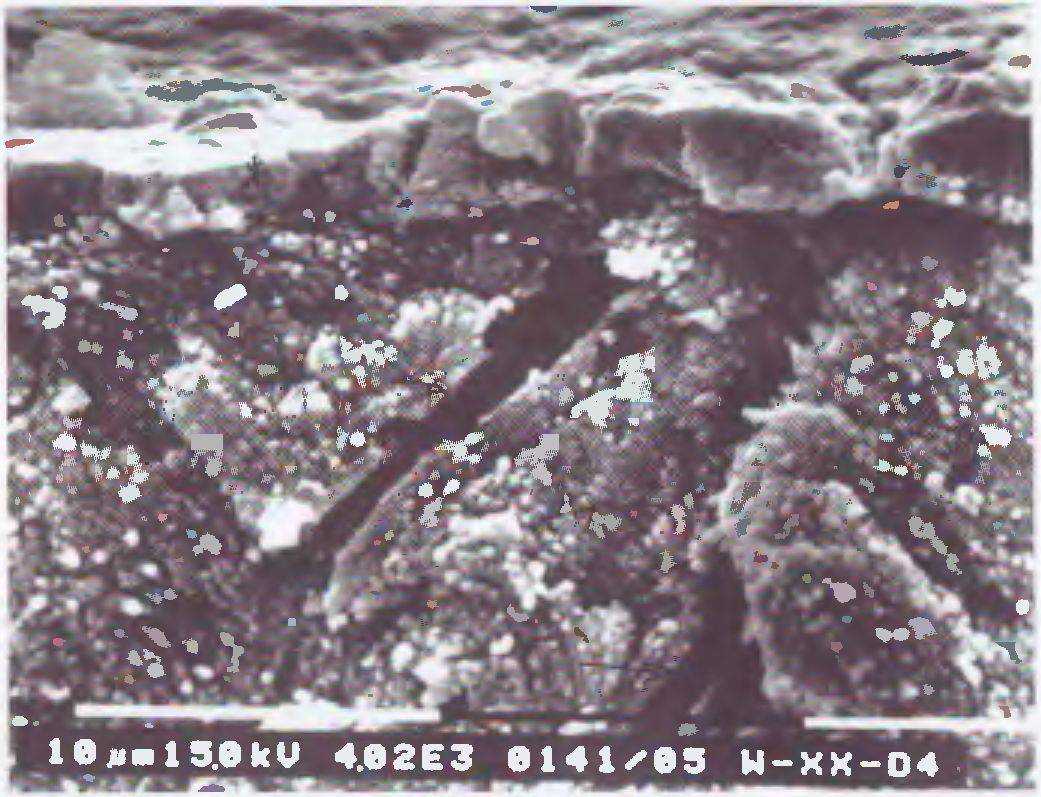 Рис. 20г. Материал «БВ»: слой минерального осадка (А) образовавшийся на поверхности дентина после минерализации материалом «БВ». Скол через препарированную полость. Зуб собаки. СЭМ. Ув. 4020