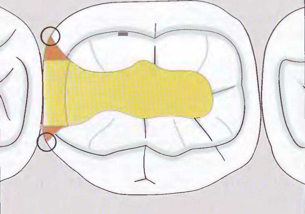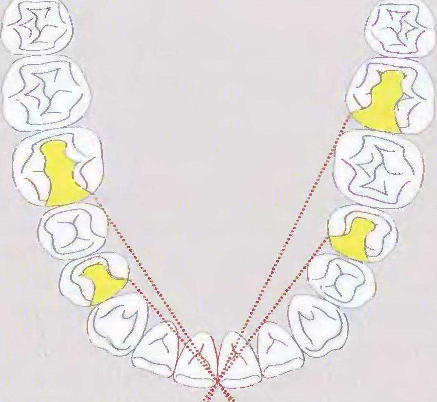 Это правило относится к полостям, расположенным на мезиальной поверхности. В полостях, расположенных с дистальной стороны зуба, это правило не используется, поскольку полость закрыта для обзора, однако расширение полости также как и на мезиальноконтактной поверхности проводится до иммунных зон. Минимальное разобщение с рядом стоящим зубом должно составлять 0,5 мм для создания адекватного доступа к границе реставрации {рис. 39).