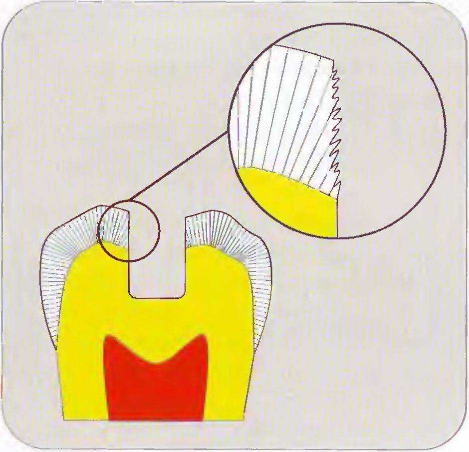 Несмотря на эти преимущества, не следует создавать скос эмали, чтобы избежать сколов керамической реставрации. Кроме этого, на окклюзионной поверхности жевательных зубов даже препарирование без скоса эмали обеспечивает обнажение концов эмалевых призм благодаря особому направлению призм на окклюзионной поверхности (рис. 52).
