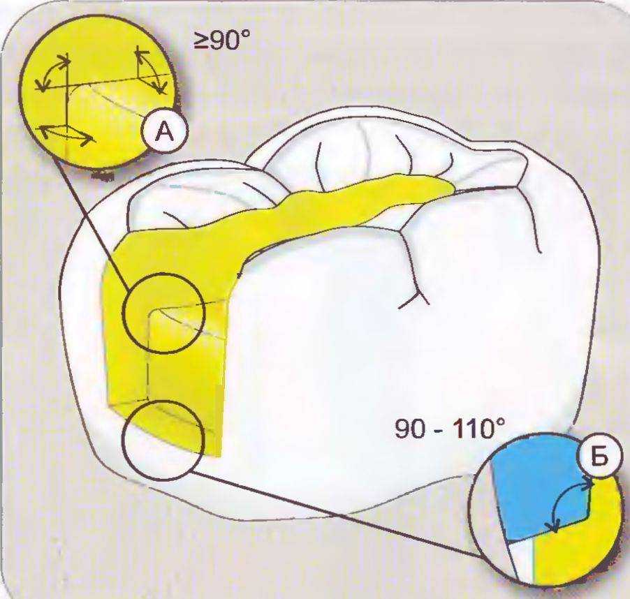 При препарировании под безметалловые вклалки все межповерхностные углы полости должны составлять не менее 90°. Это относится как к окклюзионной, так и проксимальной части полости. В придесневой области угол между осевой и пришеечной стенками может составлять от 90 до 110° из-за удаления неукрепленных эмалевых призм (рис. 53).