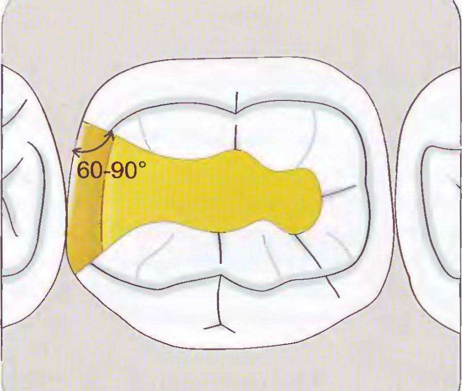 Рис. 54. Формирование латерального угла в 60—90° между вестибулярной/оральной стенками проксимальной полости и наружной поверхностью вкладки в окклюзионной проекции