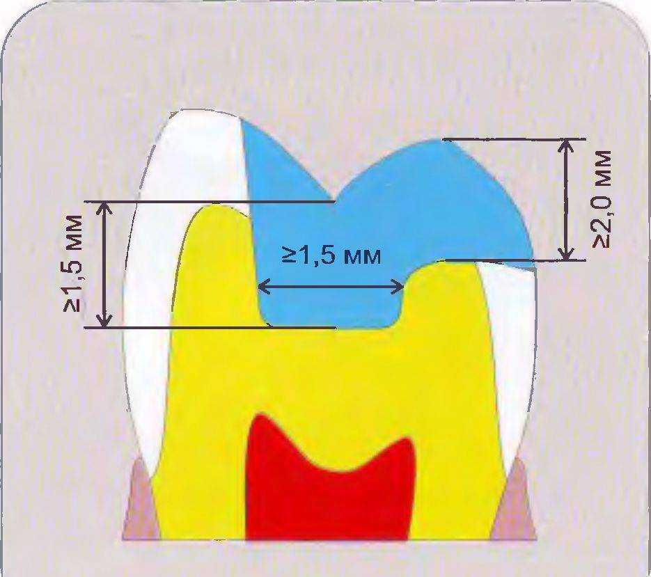 ние вкладки должно быть не меньше 1,5 мм в ширину, что позволит снизить вероятность скола реставрации. При покрытии бугорков следует следить за тем, чтобы нужное расстояние сохранялось как в положении максимального фиссурно-бугоркового контакта, так и во время функциональных движений нижней челюсти. В противном случае может произойти преждевременное нарушение краевого прилегания реставрации.