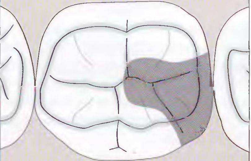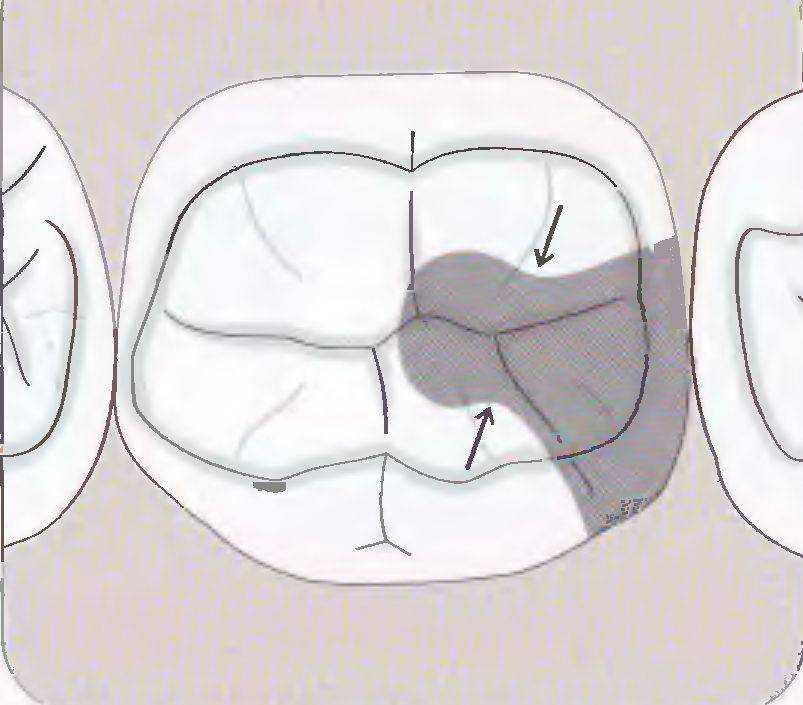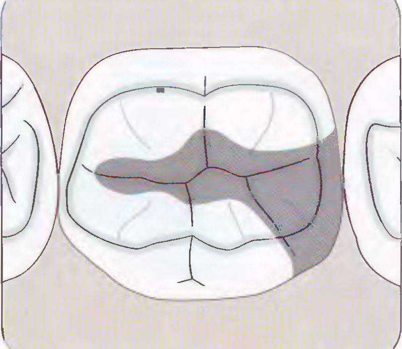 Рис. 57а. Препарирование под металлическую вкладку включает в себя большую часть окклюзионных фиссур