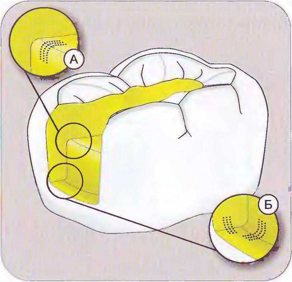 При препарировании также следует удалить любые пигментации на вестибулярных стенках полости, например, образовавшиеся от продуктов коррозии старой амальгамовой пломбы, поскольку эти пятна после фиксации реставрации будут выглядеть как черные или серые линии по ее краям. Это правило не относится к пигментированному некариозному дентину на пульпарной и аксиальной стенках полости.