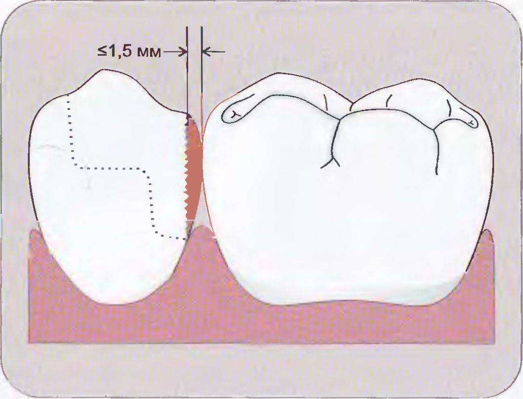 При восстановлении контактного пункта на проксимальной поверхности толщина вкладки, не опирающейся на ткани зуба, должна составлять не более 1,5 мм для предотвращения перелома керамической реставрации вследствие отсутствия упругости керамического материала. Ширина пришеечной «ступеньки» должна быть не менее 1,5 мм {рис. 60).
