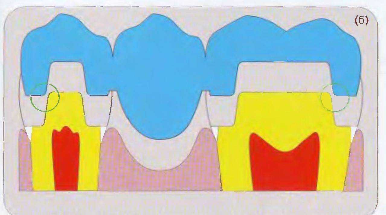 зубы из-за усадки сплава при его отливке (а); осевые стенки слегка конвергируют, что позволяет беспрепятственно накладывать протез (б)