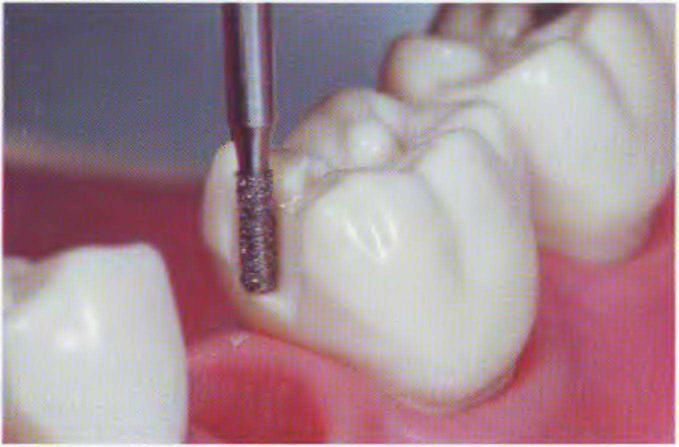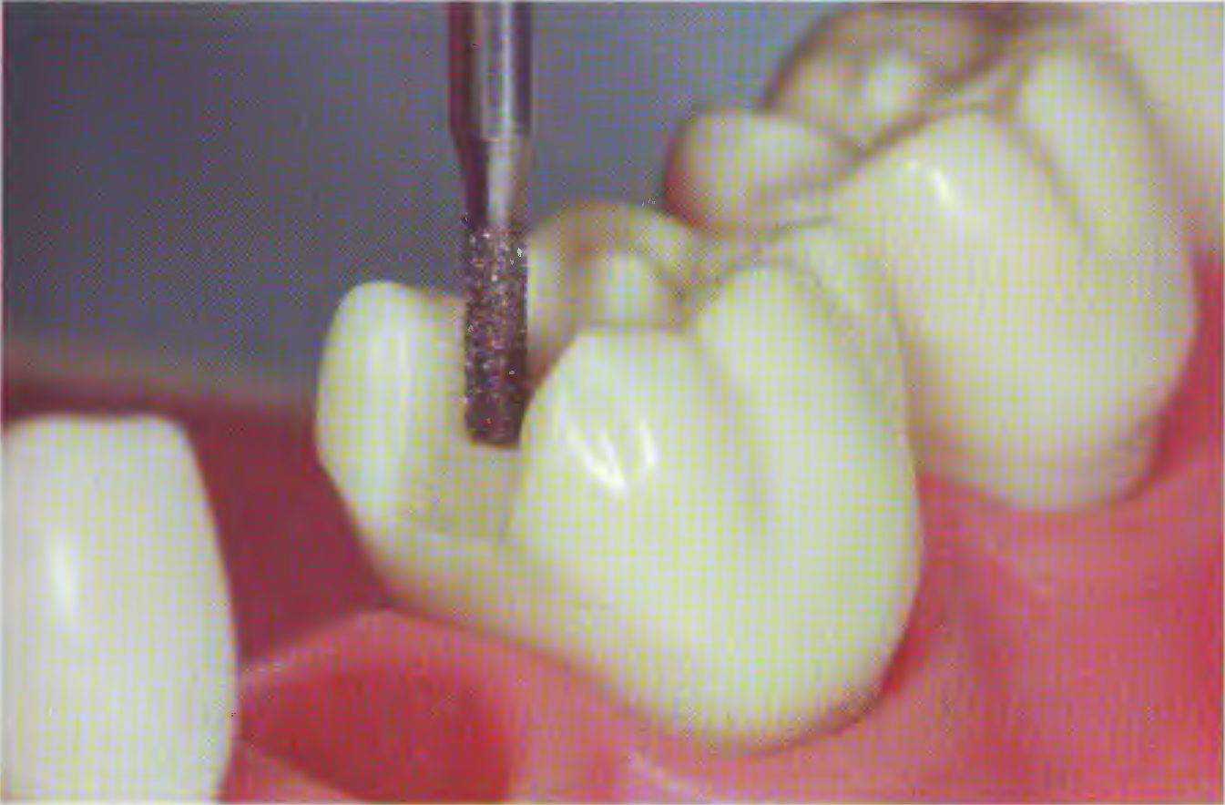 Препарирование зубов под опорные вкладки начинают с контактных поверхностей зубов, ограничивающих дефект Как известно, самоочищение затруднено больше всего в межзубном пространстве, что способствует развитию в этой зоне вторичного кариеса. Расширение контактной поверхности в вестибулярном и оральном направлении позволяет создать условия для хорошей гигиены протеза.