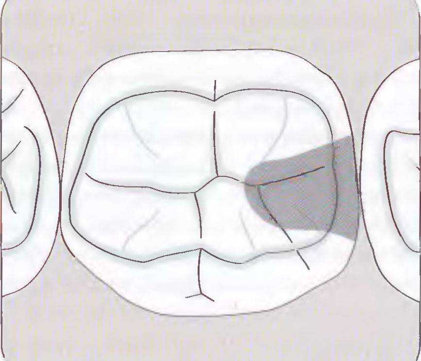 Рис. 98 а. Формирование дополнительной полости: вкладка на жевательной поверхности имеет недостаточную длину
