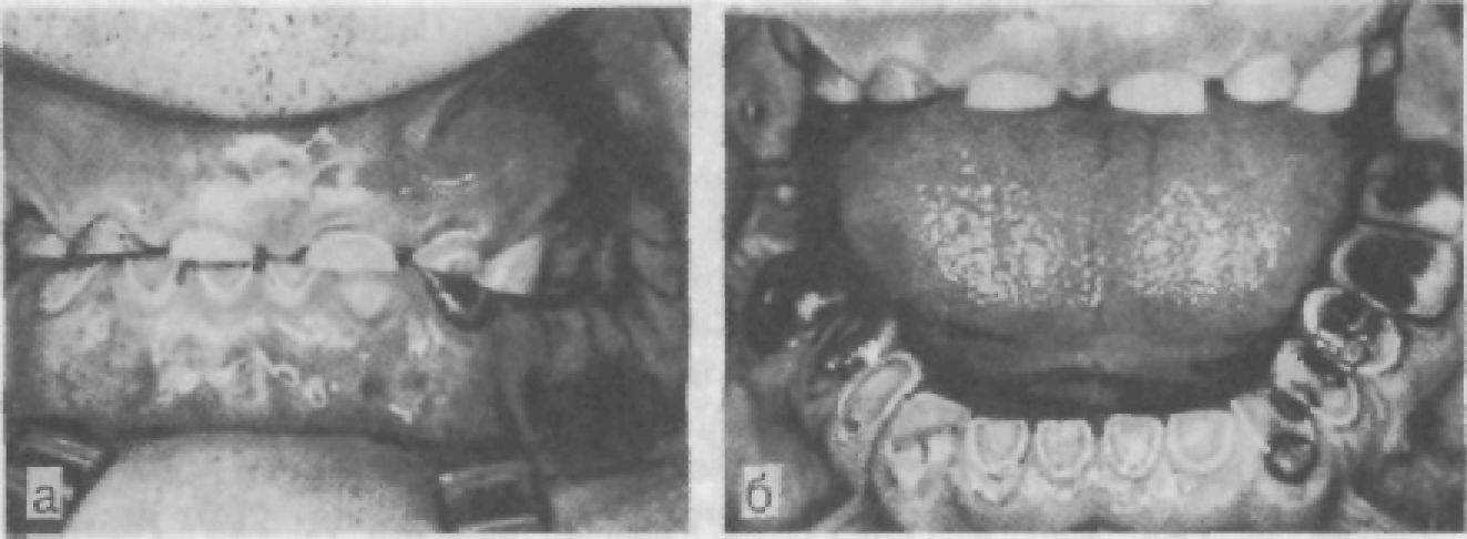 Рис. 10. Вид коронок зубов при локализованной (а) и генерализованной (б) формах патологической стертости.