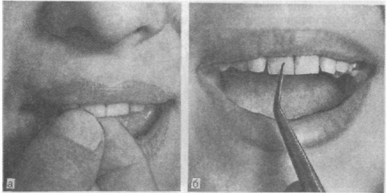 Рис. 13. Пальпаторное (а) и инструментальное (б) определение подвижности зуба.