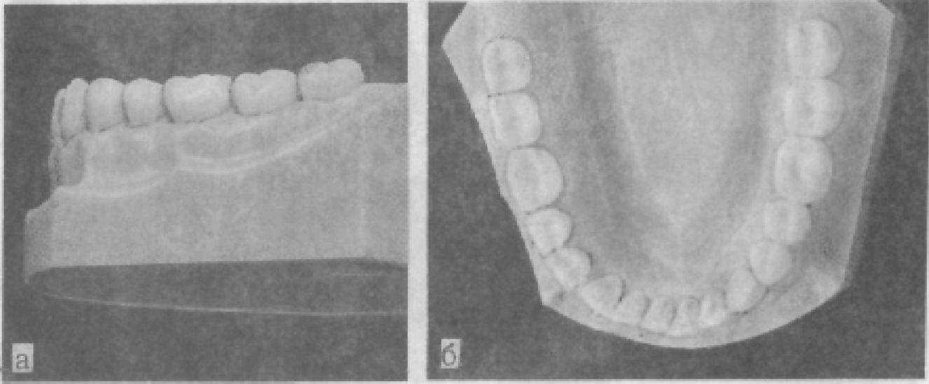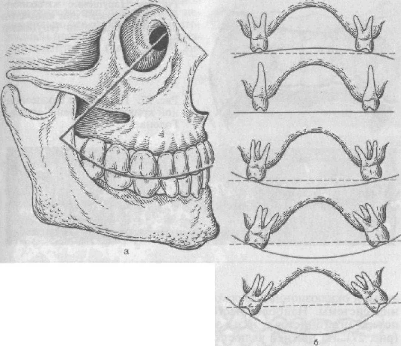 Рис. 25. Соотношение зубов нижней челюсти с окклюзионной плоскостью (а) и кривой Уилсона (б).