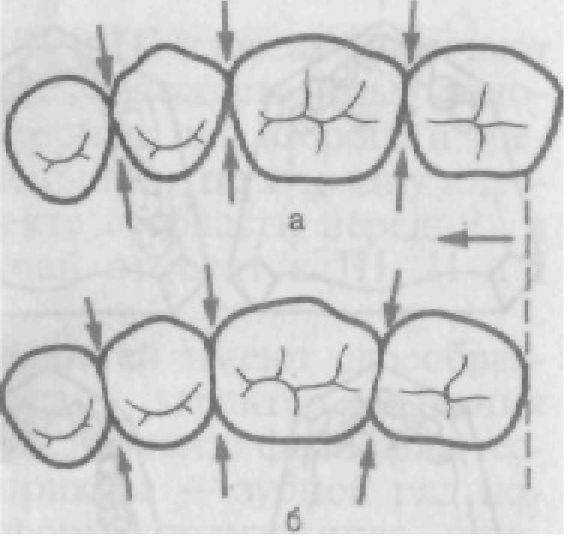 а — точечные контакты; б — плоскостные контакты. Штриховой линией показано укорочение протяженности зубного ряда.