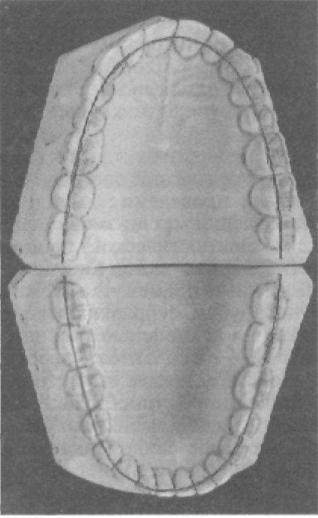 Зубные дуги верхней и нижней челюстей имеют своеобразное строение и определяют вид прикуса — характер смыкания зубных рядов. В большинстве случаев при варианте физиологической нормы — ортогнатическом виде прикуса — зубной ряд постоянных зубов, как правило, имеет форму полуэллипса, нижний — параболоидную (рис. 18). При прямом прикусе верхний и нижний зубные ряды имеют форму полуэллипса, при бипрогнатическом виде прикуса передний сегмент вытягивается как на нижней, так и на верхней челюсти кпереди. Для физиологической прогении на фоне нормального полуэллипса построения зубного ряда верхней челюсти фронтальный участок дуги нижней челюсти вытягивается кпереди. При физиологической прогнатии эти соотношения обратные.