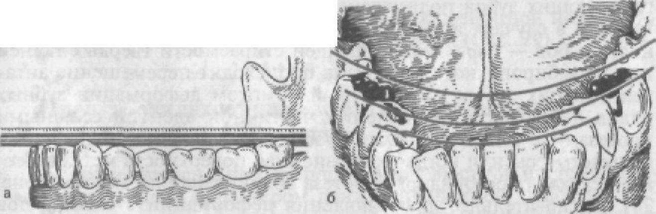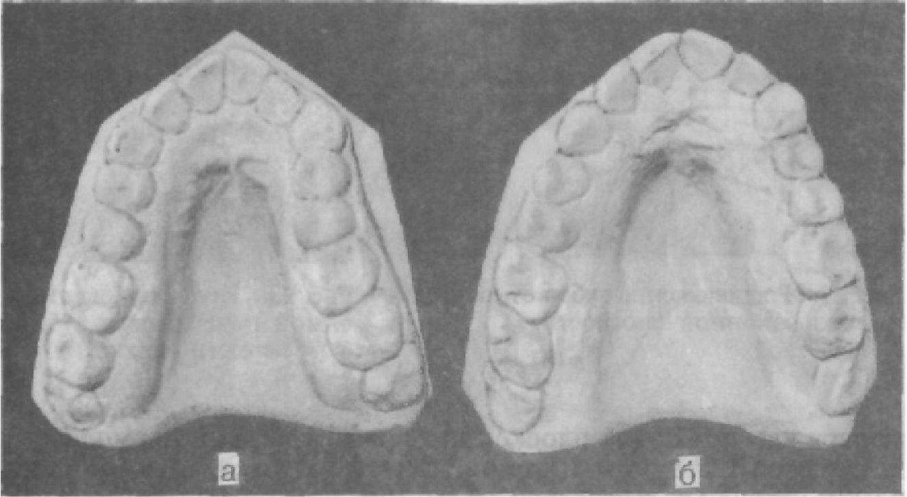 Рис. 20. Небное смещение премоляров (а) и вестибулярное (б) — центральных резцов.