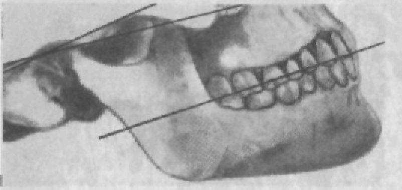 моляра касаются этой плоскости, первый и второй премоляры и моляры расположены ниже плоскости. Центральные резцы и клыки верхней челюсти на 2—3 мм ниже окклюзионной плоскости. Щечные бугорки премоляров и моляров также пересекают эту плоскость (рис. 22).