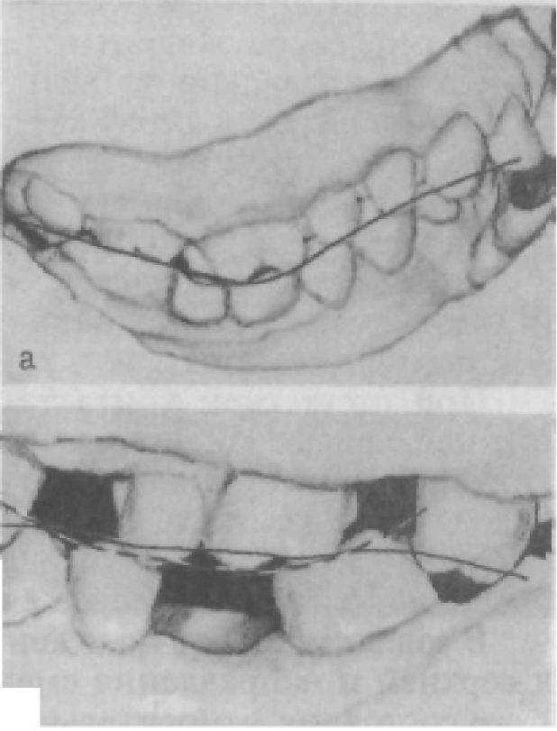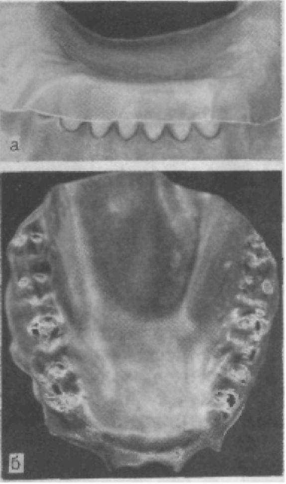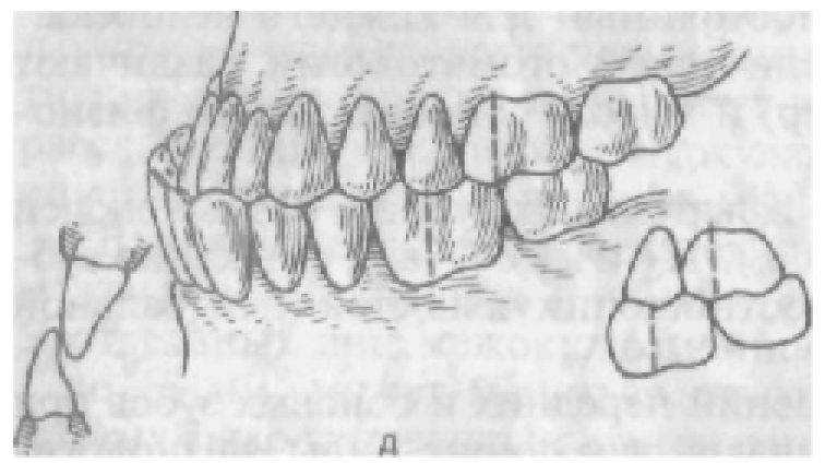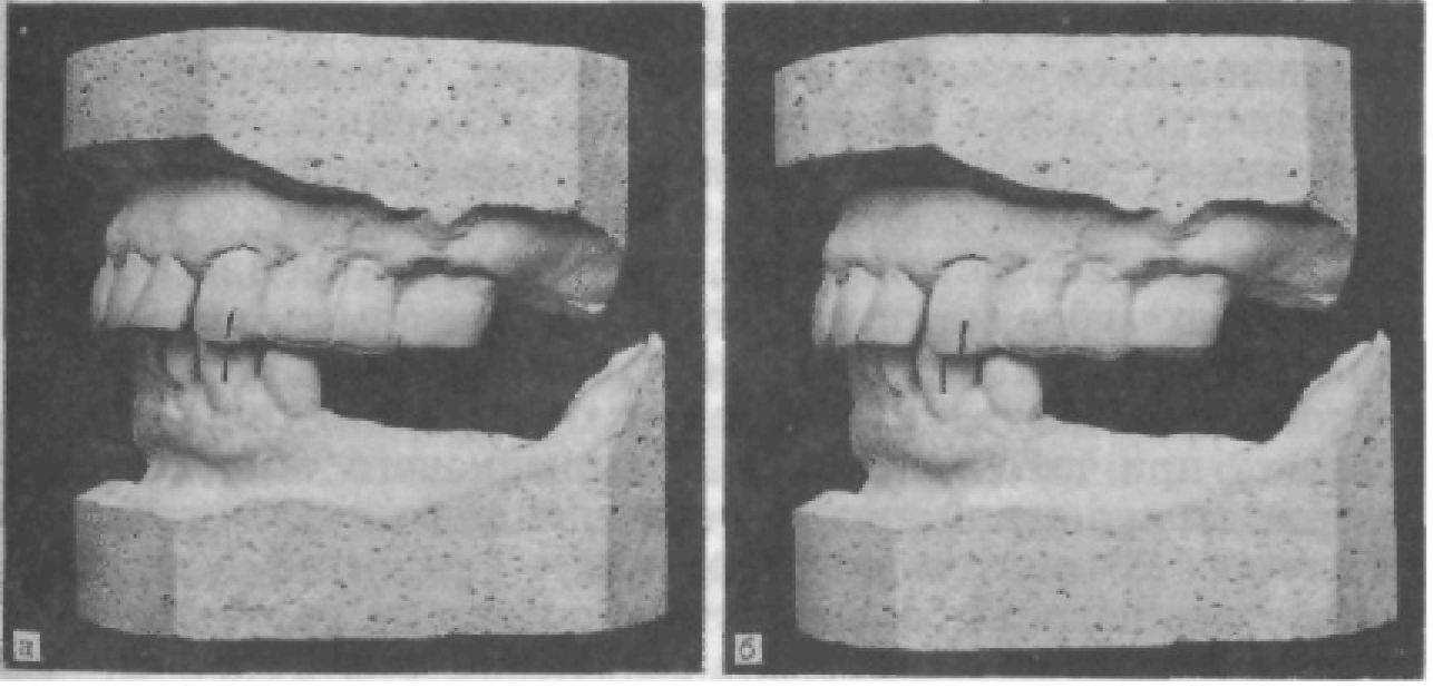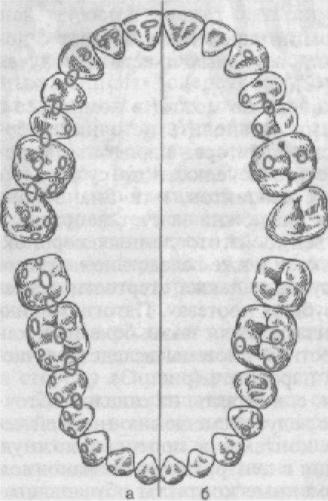 Рис. 28. Нарушение окклюзионной поверхности при пользовании неправильно изготовленным мостовидным протезом (а) и при частичной адентии (б) (наблюдение Зиберта).