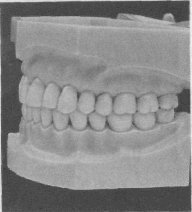 Нарушение окклюзионных соотношений зубов при частичной потере зубов, особенно жевательных, патологической стертости их обусловливает дистальное смещение нижней челюсти. Так, при обследовании зубных рядов в окклюзионном соотношении врач может установить увеличение резцового перекрытия (рис. 39), а также то, что часть зубов имеет не двух, а одного антагониста (клык нижней челюсти контактирует только с клыком верхней челюсти). Диагностическую ценность для установления дистального смещения имеют также уменьшение резцового перекрытия и установление в правильное противостояние клыков нижнего зубного ряда и других зубов по отношению к антагонистам при нахождении нижней челюсти в состоянии физиологического покоя. Косвенным доказательством является и ситуация, когда при медленном смыкании зубных рядов происходит вначале смыкание группы передних зубов (при внимательном исследовании можно увидеть, что контакт происходит по фасеткам физиологической стертости) с последующим смещением нижней челюсти кзади и увеличением резцового перекрытия.