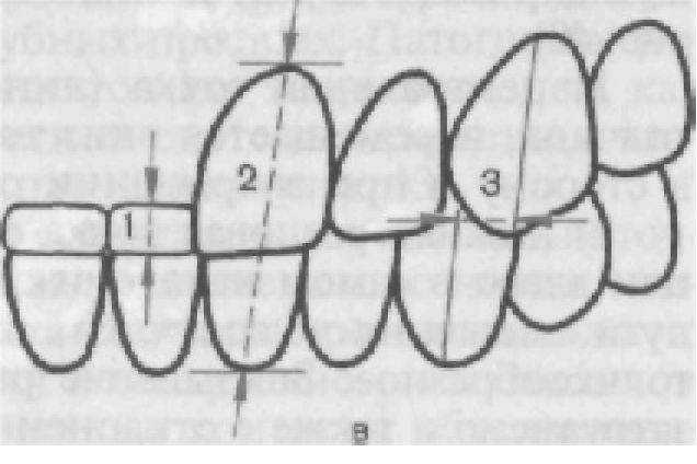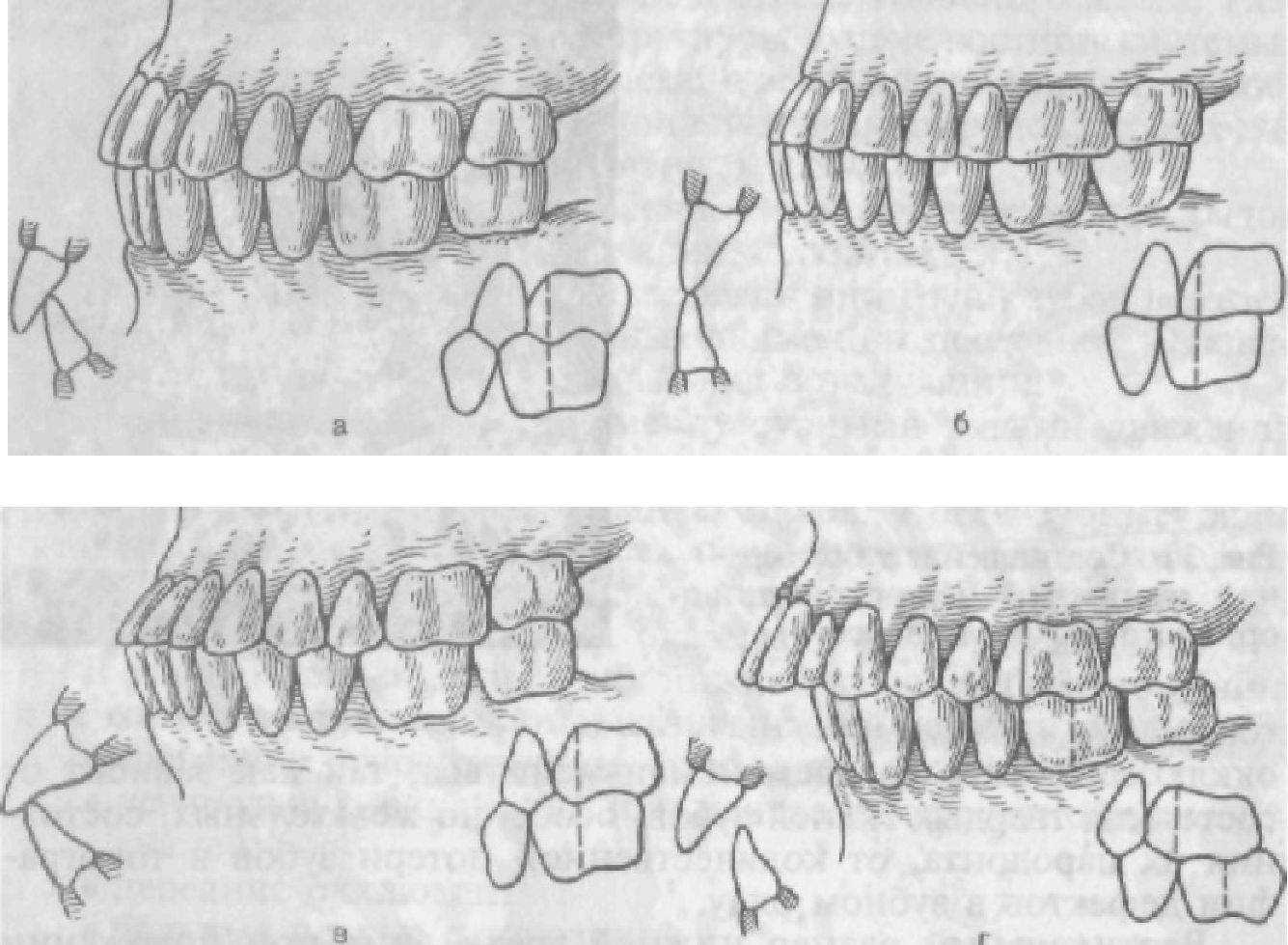 а — вторичная центральная окклюзия; о — исходная (до заболевания) центральная окклюзия; в — правильное соотношение передних зубов (схема).
