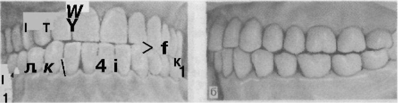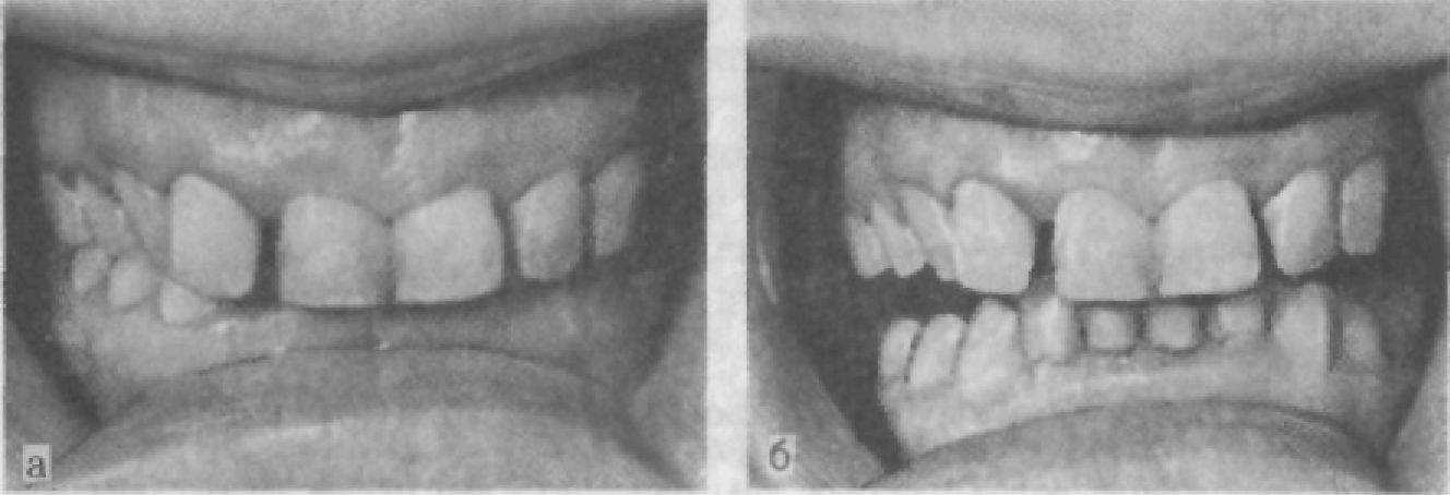 Рис. 35. Глубокий прикус. Степень перекрытия резцов нижней челюсти (а); отсутствие контакта в области жевательных зубов при передней окклюзии (б).