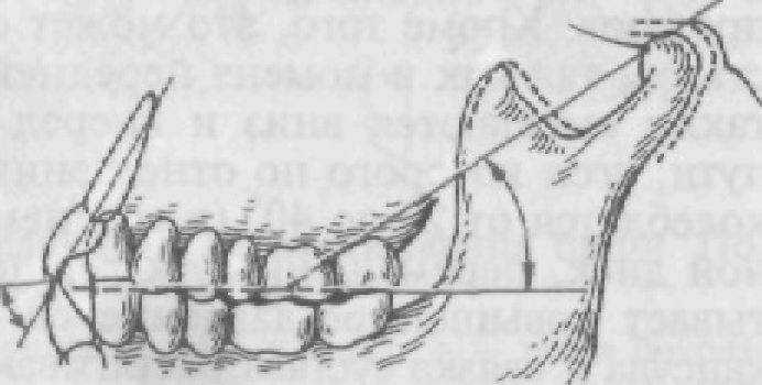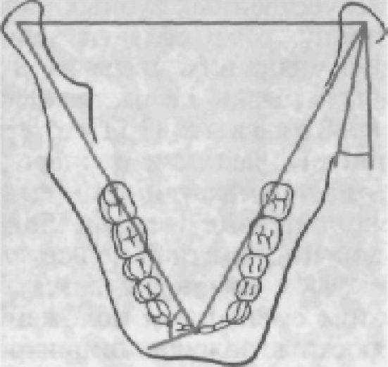 Рис. 34. Схема перемещения нижней челюсти вперед. Угол суставного и резцового путей.