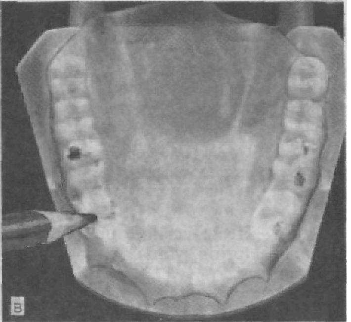 При дефектах зубных рядов можно установить смещение зубов в вертикальном направлении: зубы, не имеющие антагонистов, находятся ниже (выше для зубов нижней челюсти) окклюзионной поверхности противоположного зубного ряда (или ниже окклюзионной линии смыкания зубных рядов). Дополнительным критерием вертикального смещения зубов при сомкнутых челюстях является уменьшение или даже полное отсутствие промежутков между зубом и слизистой оболочкой альвеолярного отростка противоположной челюсти (см. рис. 27). Иногда на слизистой оболочке альвеолярного отростка можно обнаружить отпечатки бугорков или всей жевательной поверхности сместившегося зуба противоположной челюсти. В этих участках на слизистой оболочке встречаются изъязвления, что обусловливает необходимость проявить онкологическую настороженность.