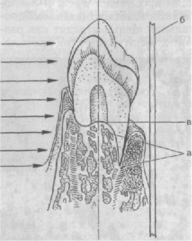 можность установить кариозные полости на проксимальных поверхностях, под искусственными коронками (но только в пришеечной зоне), наличие ретенированных зубов; при патологической стертости — ориентировочно топографию пульпы, степень проходимости каналов, наличие дентиклей. Важные данные можно получить о степени пломбирования каналов, состояния околоверхушечной ткани (разрежение костной ткани, гиперцементоз). Состояние периодонтальной щели, костной ткани альвеолярных отростков — стенок альвеол, включая замыкающую пластинку, рентгенографически можно определить только с боковых поверхностей корня зуба. Ни с вестибулярной, ни с язычной (небной) поверхности состояние околоверхушечных тканей, периодонтальной щели и стенок зубных альвеол выявить по рентгенограммам нельзя (рис. 57) (редкое исключение составляют случаи остеосклероза этих участков).