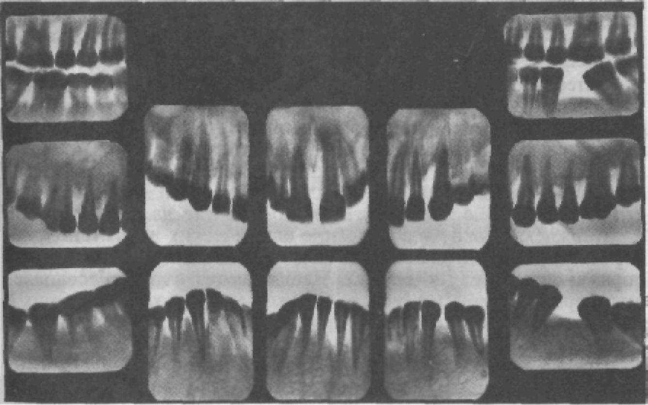 Рис. 58. Скомпонованная из серии внутриротовых снимков рентгенограмма зубов верхней и нижней челюстей.