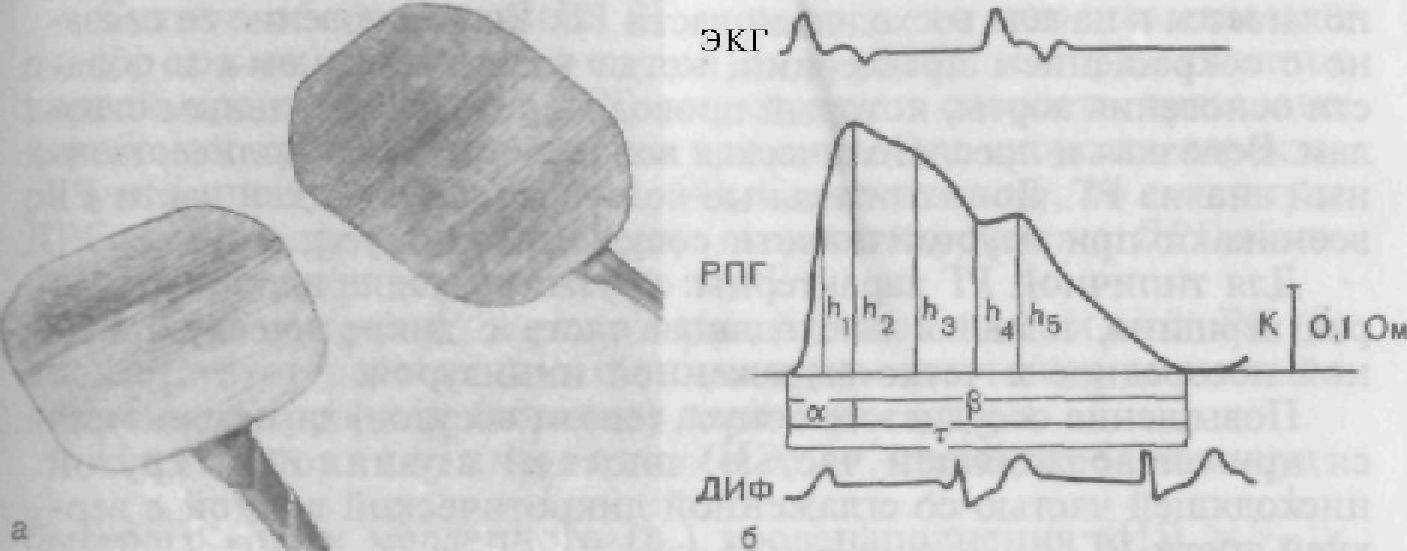 Рис. 64. Датчики для реографии (а) и схема реопародонтограммы (б). Объяснение в тексте.