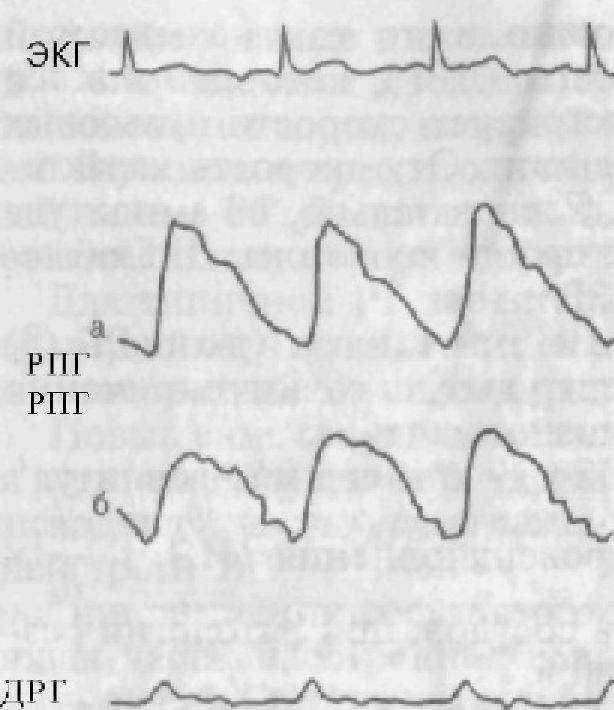 Повышение сосудистого тонуса (спазм сосудов) характеризуется крутой восходящей частью, плоской вершиной и крутой нисходящей частью со сглаженной дикротической волной в верхней трети РГ.