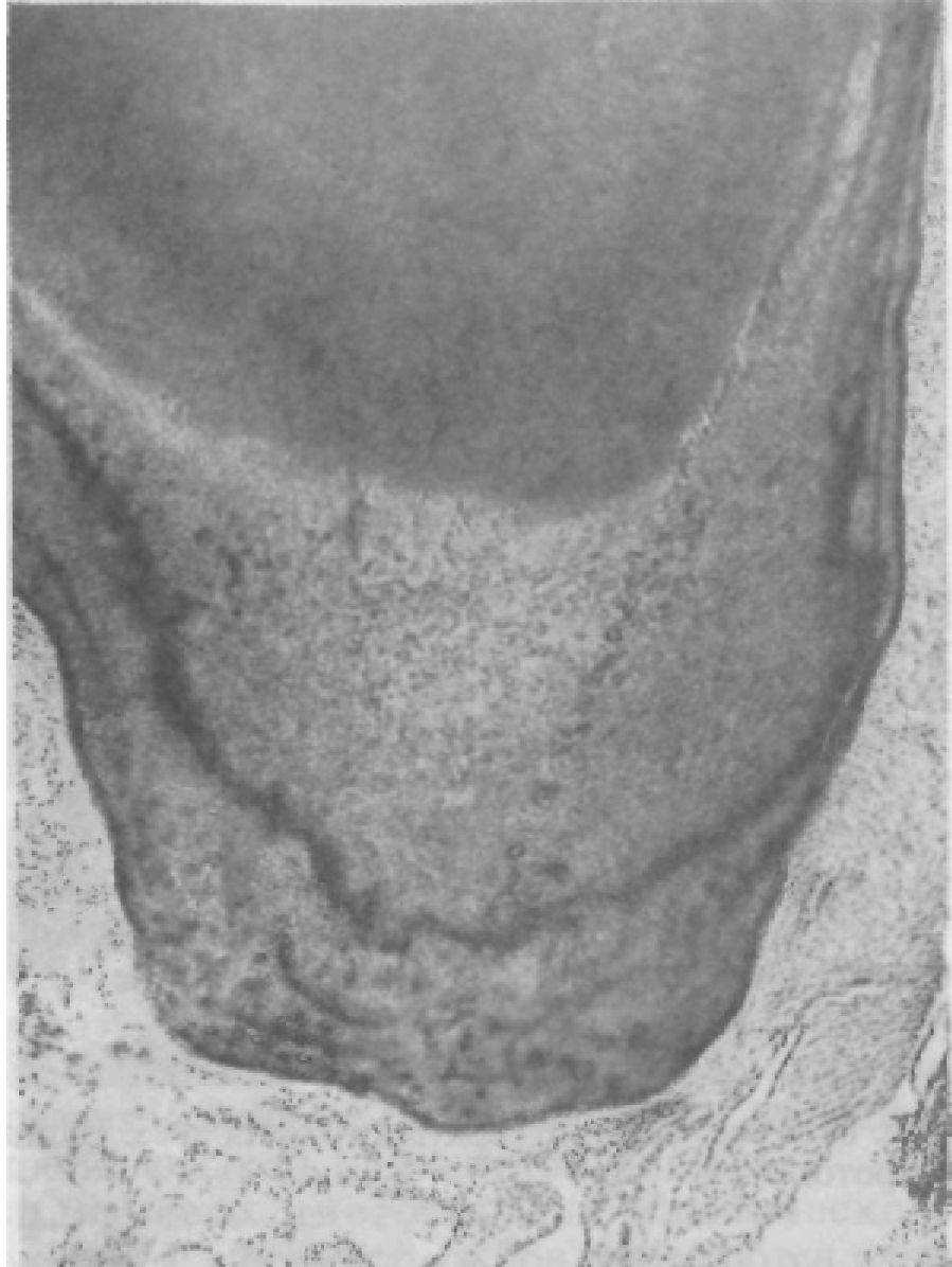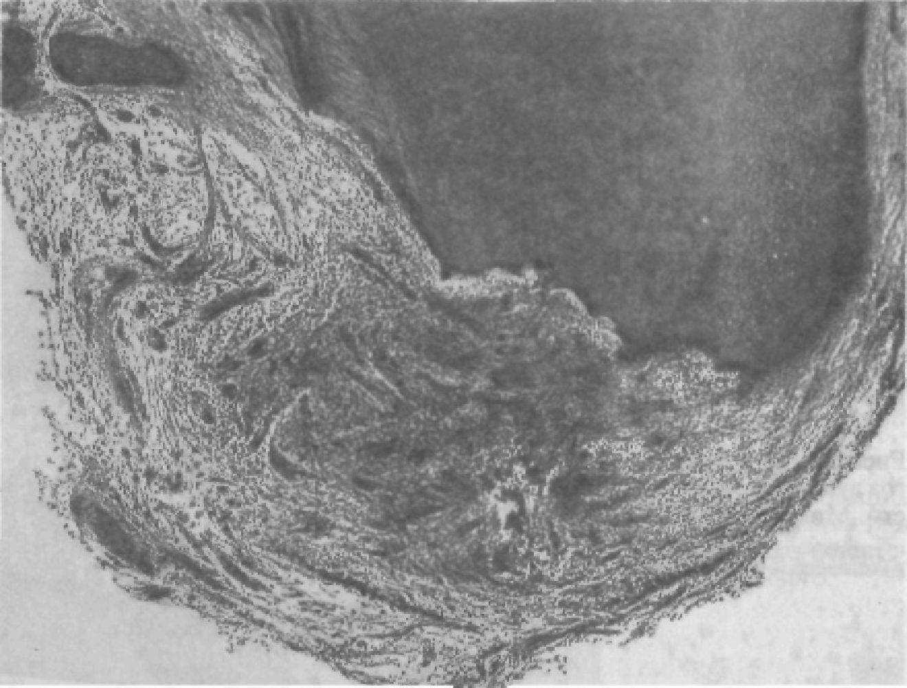 Рис. 87. Рассасывание верхушки корня зуба. Видна также гранулема. Микрофото.