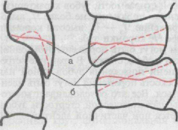 Рис. 89. Виды патологической стираемости. а — вертикальная; 6 — горизонтальная.