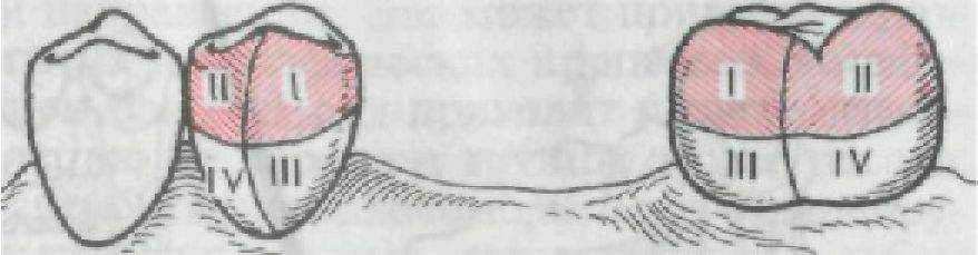 Поверхности коронки зуба, выбранного для кламмерной фиксации, с вестибулярной и оральной сторон имеют линии наибольшей выпуклости в горизонтальном и вертикальном направлениях, при пересечении образующие четыре квадранта (рис. 124). Нумерация квадрантов принята со стороны дефектов зубного ряда: I и II квадранты называются окклюзионными, а в функциональном отношении — опорными; III и IV — соответственно гингивальными и ретенционными.