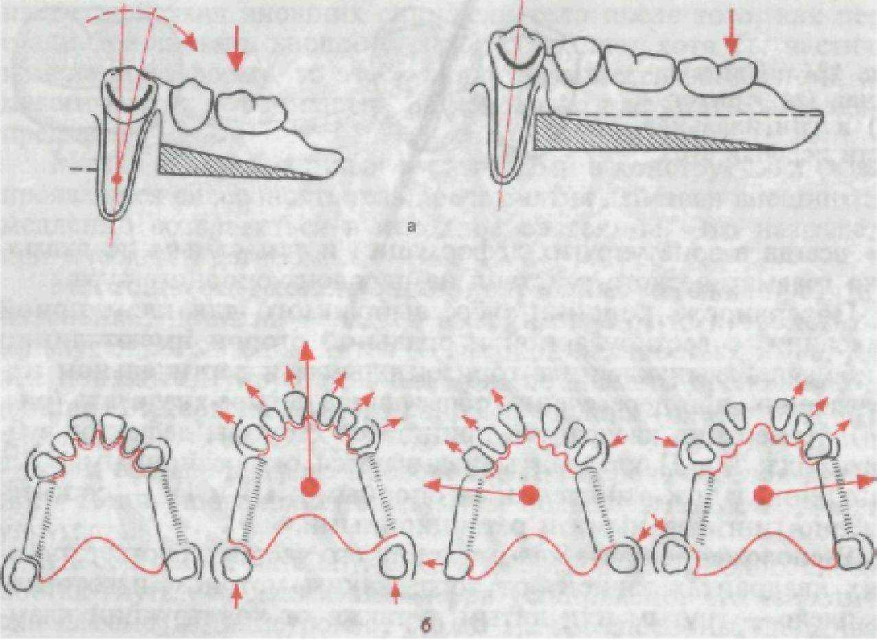 Рис. 125. Действие проволочного кламмера на пародонт опорного зуба при вертикальной (а) и горизонтальной (б) нагрузке на седловидную.