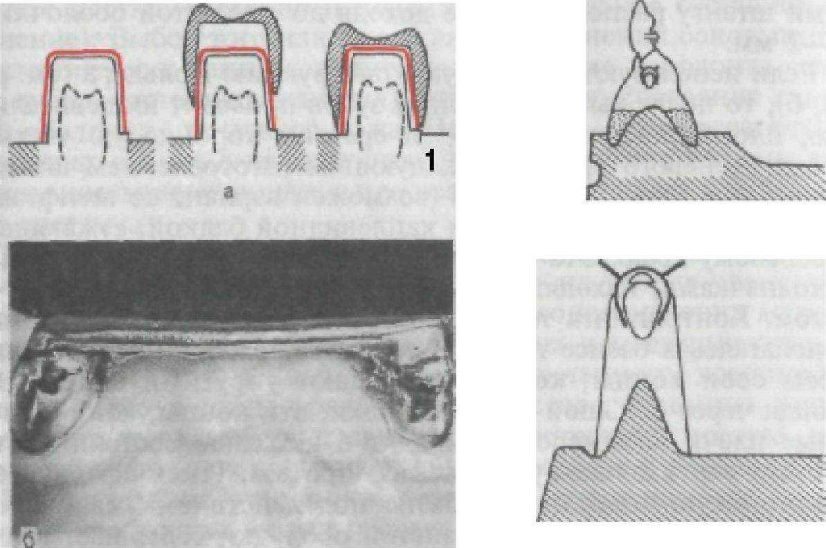 128, б), то после выбора опорных зубов проводят их девитализацию, пломбирование каналов и срезают коронковую часть до уровня десневого края с последующим изготовлением штампованных или литых колпачков (возможен вариант со штифтами), соединенных яйцевидной или каплевидной балкой, сужающейся к десневому краю. Эта опорная балка может располагаться между колпачками, находящимися на расстоянии или рядом друг с другом. Контрштанга точно повторяет форму опорной части и, располагаясь в базисе протеза, сохраняет свободными от пластмассы свои концы, которые обладают упругими свойствами. Пройдя через большой диаметр балки, эти концы, какретенционные плечи кламмеров, приходят в исходное состояние, препятствуя вертикальному смещению протеза. Имея сферическую конгруэнтную поверхность, базис под действием жевательного давления и податливости слизистой оболочки совершает вращательное движение вокруг оси балки, не создавая отрицательных боковых нагрузок на пародонт опорных зубов. Система Дольдера показана преимущественно при изготовлении протезов на нижнюю челюсть. Она расширяет показания к сохранению и корней зубов, так как фиксация и стабилизация протезов на нижней челюсти при полном отсутствии зубов остается трудноразрешимой проблемой. И в той, и в другой конструкциях необходимо предусмотреть сохранение зазора 0,2—0,3 мм между штангой и контрштангой в спокойном положении протеза на челюсти с учетом погружения базисов в слизистую оболочку протезного ложа.