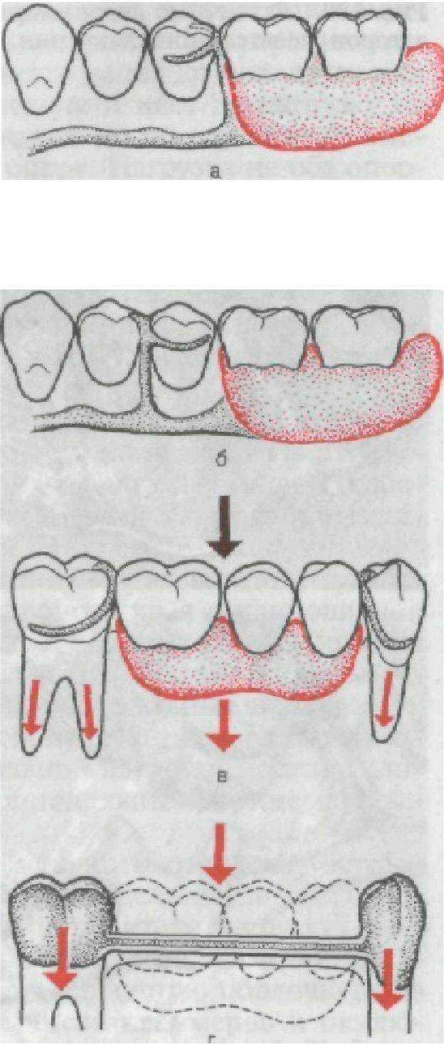 В случае перенесения нагрузки в область дистальной трети базиса опорный зуб испытывает отрицательную реакцию, т. е. опорно-удерживающий кламмер (Аккера) как бы стремится извлечь зуб из лунки. Подлежащие ткани испытывают при этом давление, превышающее значение действующей Р. •.