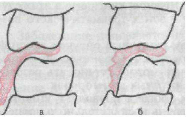 Рис. 143. Направление смещения пищевого комка при хорошо выраженном клиническом экваторе коронки зуба (а) и при его отсутствии (б), приводящее к травме десневого края.