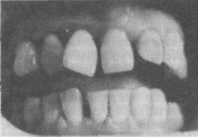 Осматривая зубные ряды и определяя степень патологической подвижности, одновременно оценивают положение каждого зуба в зубной дуге. При пародонтитах возможно смещение зубов в вестибулярную, оральную стороны, в вертикальном направлении, повороты вокруг вертикальной оси. Как правило, это сопровождается появлением промежутков (см. рис. 21) между зубами, наложением одного зуба на другой.