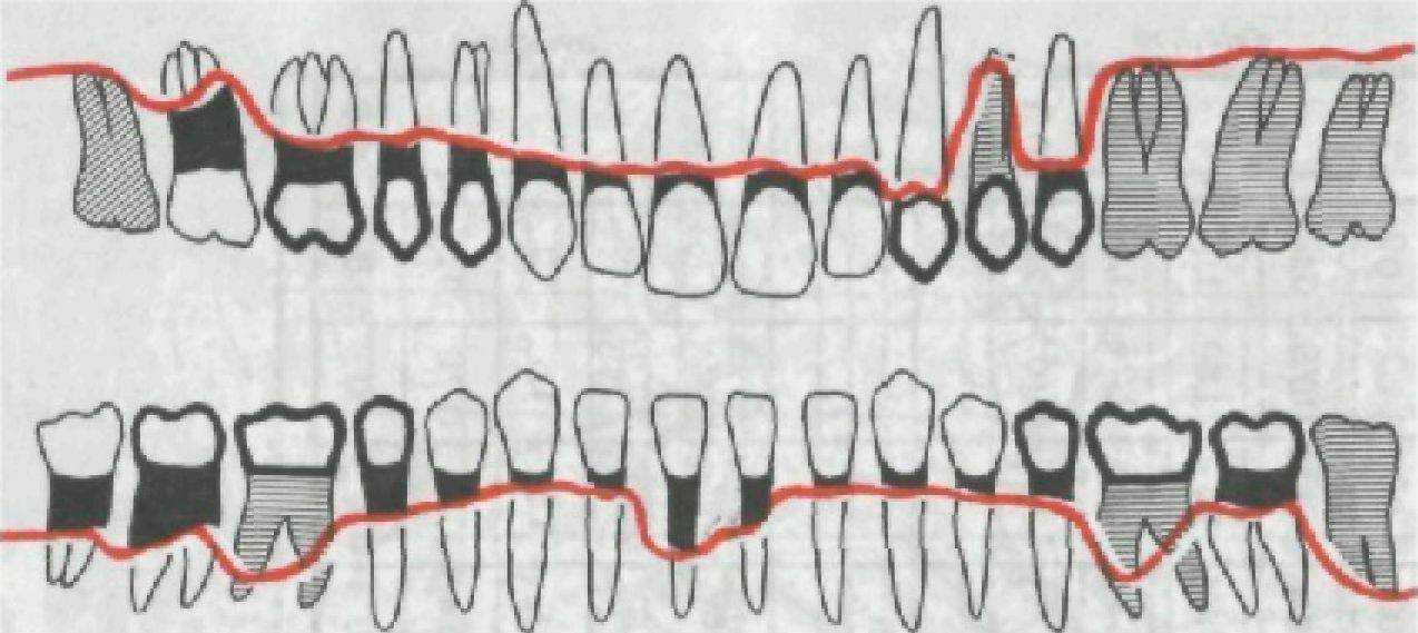 Рис. 151. Вариант графической записи степени резорбции костной ткани стенок альвеол.