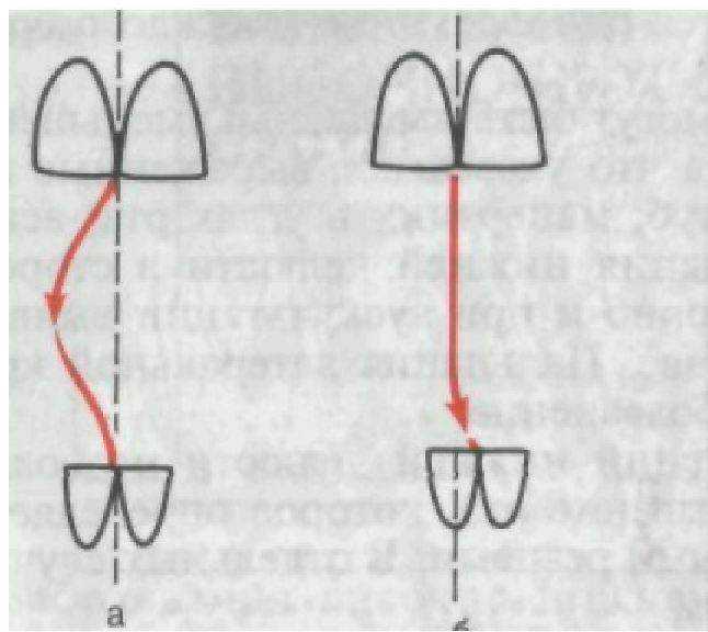 Рис. 178. Варианты перемещения резцовой точки при открывании рта у больных с артрозом височно-нижнечелюстного сустава. Объяснение в тексте.