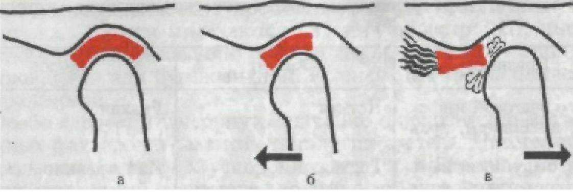 Для БСД характерно щелканье, вероятной причиной которого является повышение тонуса латеральной крыловидной мышцы. Механизм возникновения щелканья в суставе при спастических сокращениях латеральной крыловидной мышцы можно представить следующим образом. Например, на фоне нормального функционирования нижней челюсти в фазе передней окклюзии в силу какого-то фактора, например стресса, наступил спазм латеральной крыловидной мышцы. Допустим, что в этот момент головка нижней челюсти и диск находились на скате суставного бугорка (рис. 180). При возврате нижней челюсти головки смещаются назад, а диски удерживаются в переднем положении за счет спазма латеральных крыловидных мышц. На пути движения головок возникает препятствие — задний полюс дисков, в момент преодоления которого возникает щелкающий звук. Условно это щелканье можно назвать заднеполюсным при закрывании. Если в этот момент быстро открыть рот, то щелканье может вновь возникнуть при преодолевании заднего полюса (заднеполюсное щелканье при открывании). В этот момент возможна блокировка движения нижней челюсти, если головка не сможет преодолеть задний полюс диска.