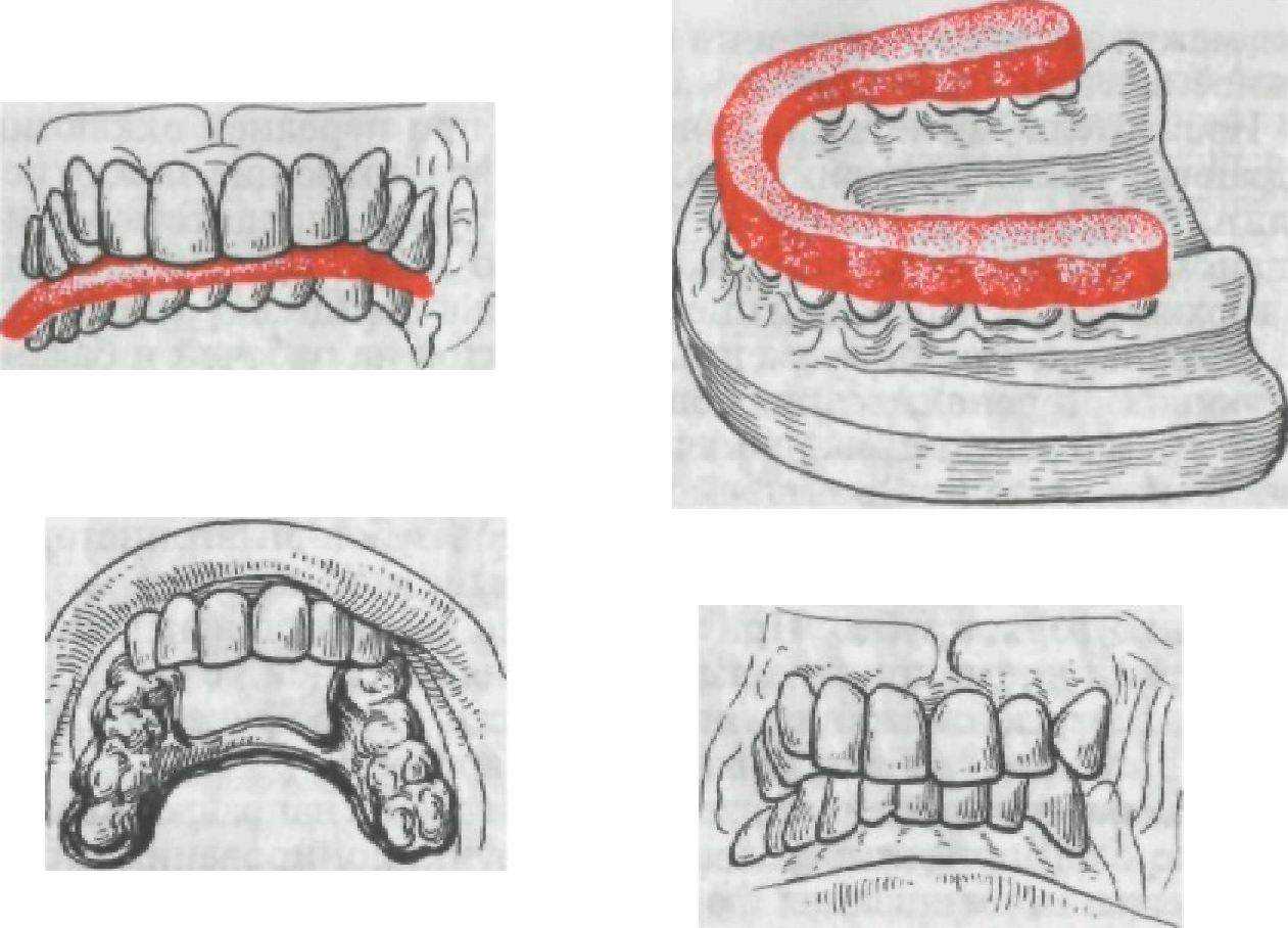 Рис. 182. Ортопедические аппараты и зубные протезы, применяемые при лечении артрозов височно-нижнечелюстного сустава.