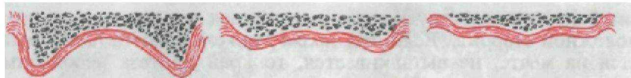 крепления мышц с внутренней и внешней сторон. Тем не менее практика показывает, что ни одной из классификаций не удается предусмотреть все многообразие встречающихся вариантов атрофии челюсти. Кроме того, для качественного пользования протезами не меньшее, а иногда и большее значение имеют форма и рельеф альвеолярного гребня. Наибольший эффект стабилизации достигается при равномерной атрофии, широком, а не высоком и узком гребне. Эффективной стабилизации можно достичь при любых клинических ситуациях, если учтено отношение мышц к альвеолярному отростку и топография клапанной зоны.