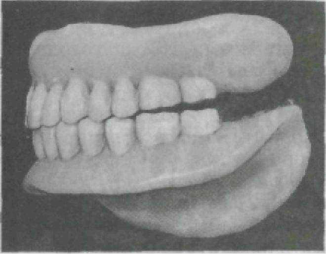 Рис.221. Соотношение зубных рядов при фиксации нижней челюсти со смещением кзади.