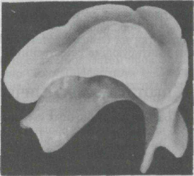 Язык является мощным мышечным органом, принимающим активное участие в акте жевания, глотания и образования речи. Поэтому конструирование искусственных зубных рядов и базисов протезов необходимо проводить в соответствии с функциональными особенностями движений и формой последнего. Зубная дуга ни в коем случае не должна быть зауженной, а базис нижнего протеза необходимо смоделировать таким образом, чтобы он имел вогнутую поверхность как с язычной, так и со щечной стороны (рис. 224).
