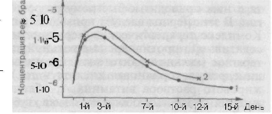 Рис. 236. Кинетика выделения серебра из металлизированных пластмассовых протезов в слюну.